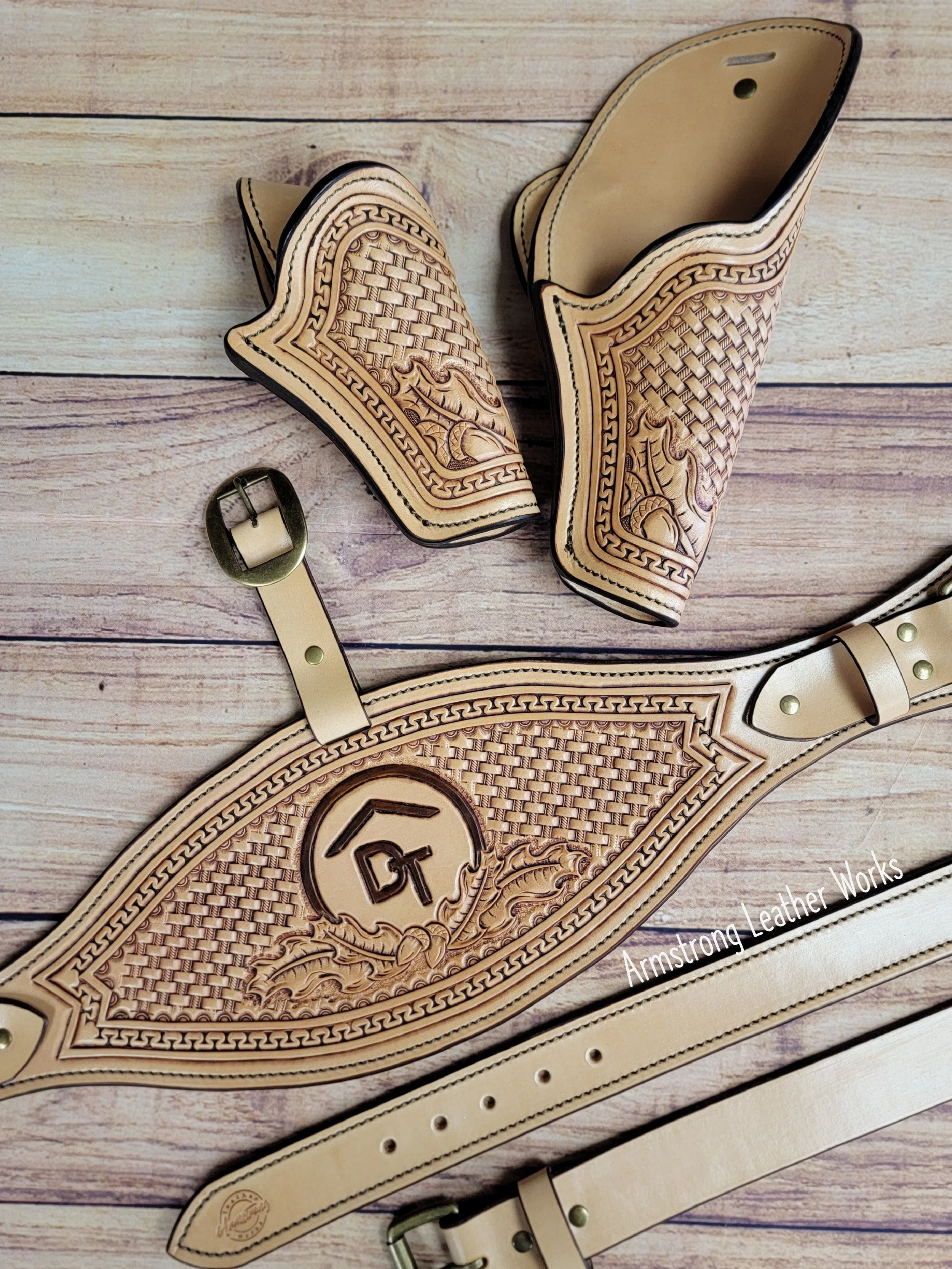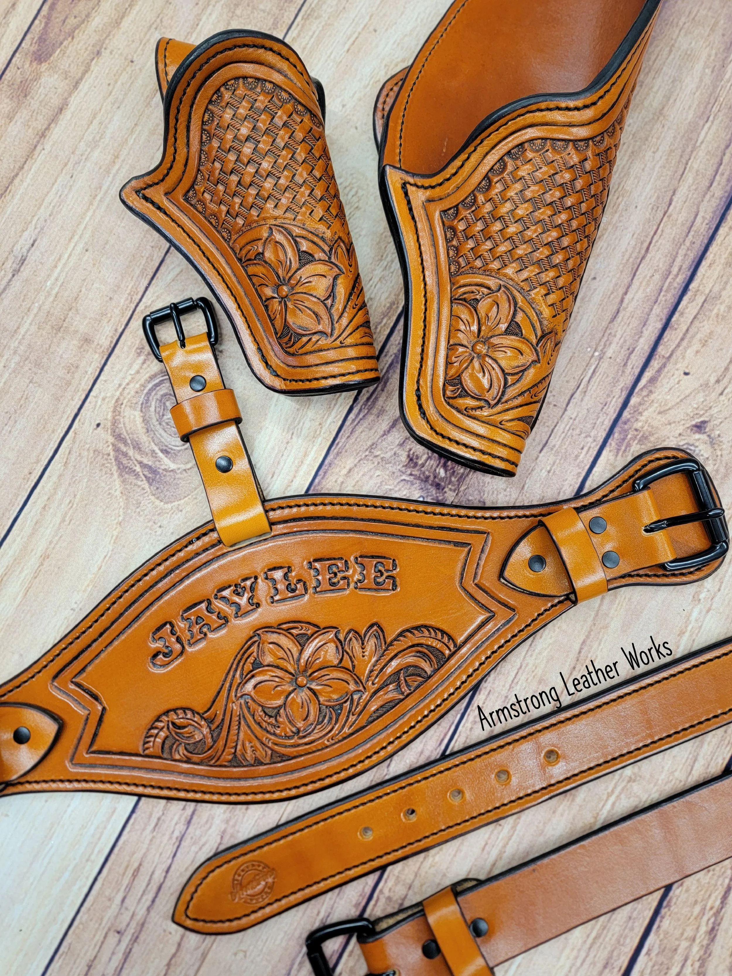 Our dump holsters are definitely our most popular design. They have been tested, approved, and are used by some of Utah’s top mounted shooters, our holsters are handcrafted to your measurements for a perfect custom fit. The dump holster allows for a smoother gun change and helps guide the gun in from several inches above the main body of the holster and then locks into place. The addition of the shoulder strap along with bottom belt provide extra support to keep your holsters securely in place. Your gun will be in exactly the same spot every time you reach for it, saving those fractions of a second that get you to the pay window.